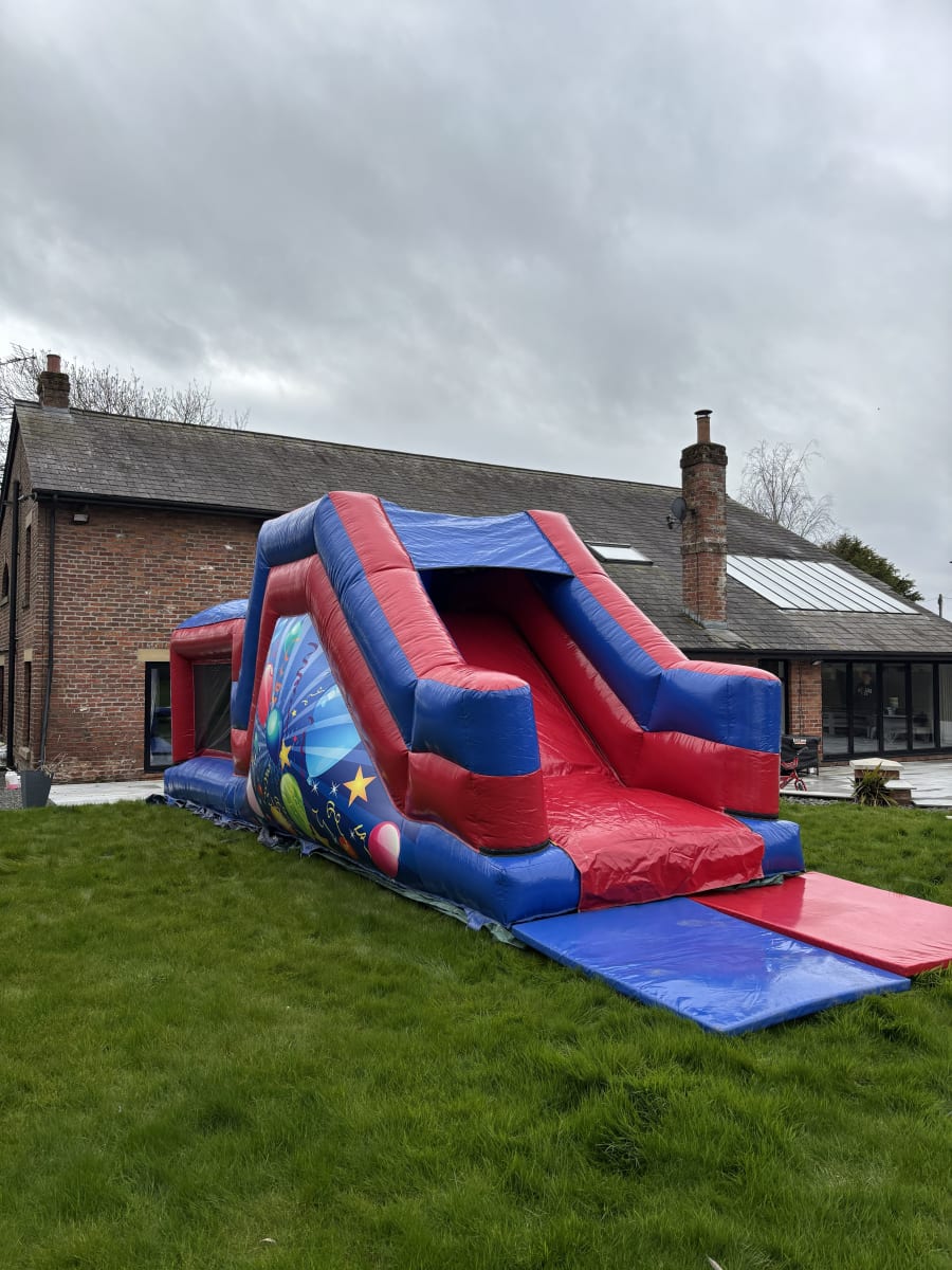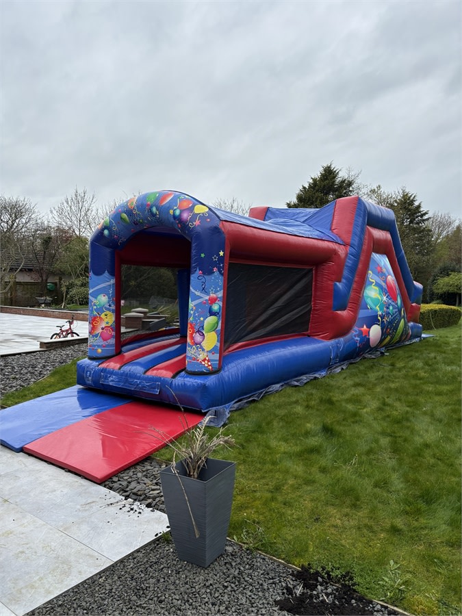 Make your next event unforgettable with the 27foot Party Time 1 Part Assault Course. This 27 foot long inflatable obstacle course features a 7 foot slide and fun bish-bash-bosh obstacles. Bright blue and red colours create a party-ready look. Perfect for birthdays, school fairs, and community events. Book this popular inflatable and enjoy safe, thrilling play for children. 🪂